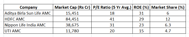 This comparison highlights that while HDFC AMC leads in terms of valuation multiples and market share, other players like Nippon Life India AMC, Aditya Birla Sun Life AMC & UTI AMC also offer strong financial metrics, presenting diverse opportunities for investors.