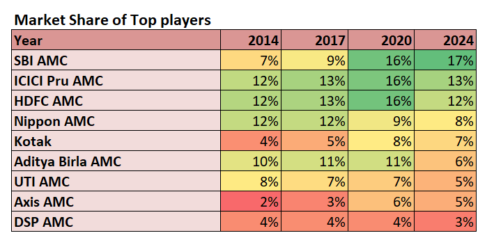 Market Share and Competitive Position: Analyzing an AMC’s market share, particularly in equity and debt funds, helps assess its competitive position and growth potential. SBI AMC stands out with a rapid pace in AUM growth, allowing it to earn the largest AMC tag in India since Dec 2021. SBI AMC doubled its market share from ~8% in Mar 2016 to 17% in March 24. Similarly, Axis AMC witnessed multifold growth in AUM with an improvement in market share to ~5% in March 24 from ~3% in Mar 2016 whereas Kotak AMC improved its market share to ~7% in March 24 from ~4.4% in March 2016.