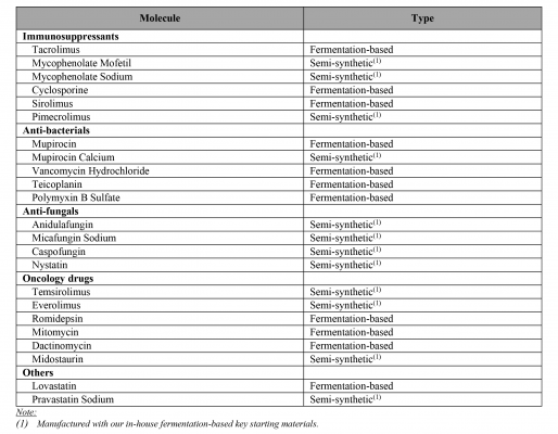 (a) APIs through fermentation as well as semi-synthetic processes, across therapeutic areas of immunosuppressants, oncology, and anti-infectives.
