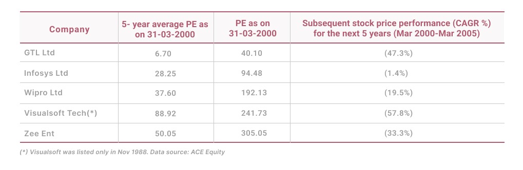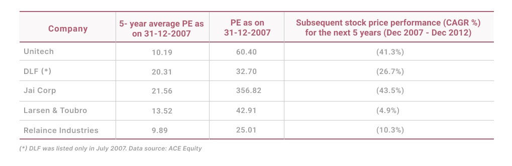 During the tech boom of 2000, ‘tech’ stocks became extremely popular as the benefits of computerization in the Western world were reaped by Indian IT players, particularly due to Y2K. This led to extremely high P/E valuations when compared to their historical means. This implied that the major chunk of wealth creation occurred due to re-rating rather than earnings growth, clearly indicating excessive valuations. Over the next 5 years, these stocks significantly eroded investor wealth on both an absolute and relative basis. Even though the businesses of quality companies such as Infosys grew at a high CAGR of nearly 36% between 2000 and 2006, there is no antidote for unreasonably high valuations.