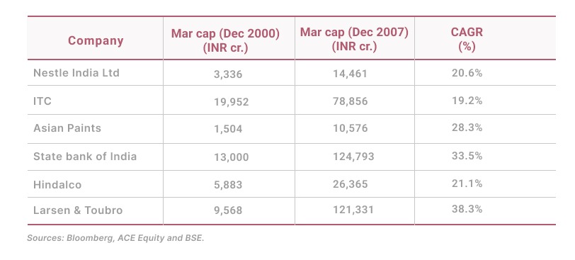The excess in valuation was not widespread across the industry, and ‘old economy’ stocks were spared from market excesses. As a result, various high-quality businesses such as Nestle India, ITC, and Asian Paints were available at decent valuations. Even if an investor purchased shares of these companies at the height of the tech boom, he would have made spectacular returns till the end of the next bull market.