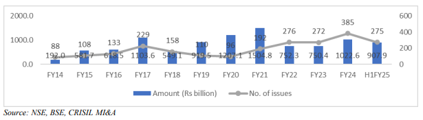 Additionally, the average fee per BRLM has risen substantially across most issue size categories. For example, the average fee for issues between Rs 10 billion and Rs 20 billion has increased 2.3 times from FY20 to FY24. Even in H1FY25, the average fee per BRLM saw a notable rise compared to FY24, reflecting the growing income in the industry and the increasing demand for expert financial advisory services in the capital markets.