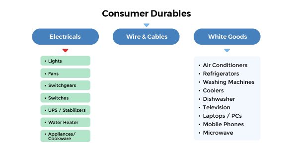 The consumer durables sector is segmented into three major categories based on usage: electricals, wires and cables, and white goods. Within the electricals segment, the major products based on market size are lights, fans, and switches.