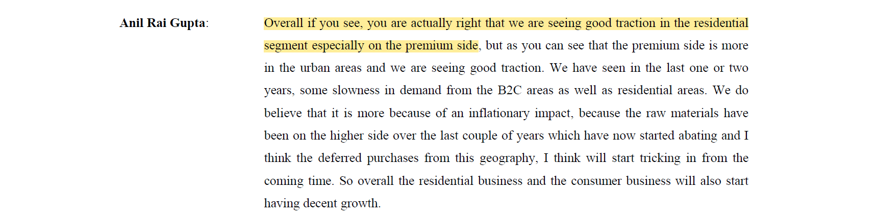 Premiumization- In line with the trend of premium products experiencing high demand, a similar pattern is observed in the consumer electrical sector. All players are focusing on premium products, but only a few of them can sustain continued price hikes. In select cases, market participants have been comfortable sacrificing some volume while catering to premium categories.