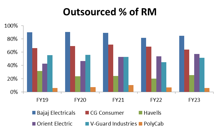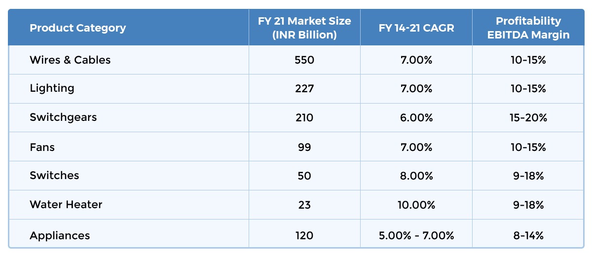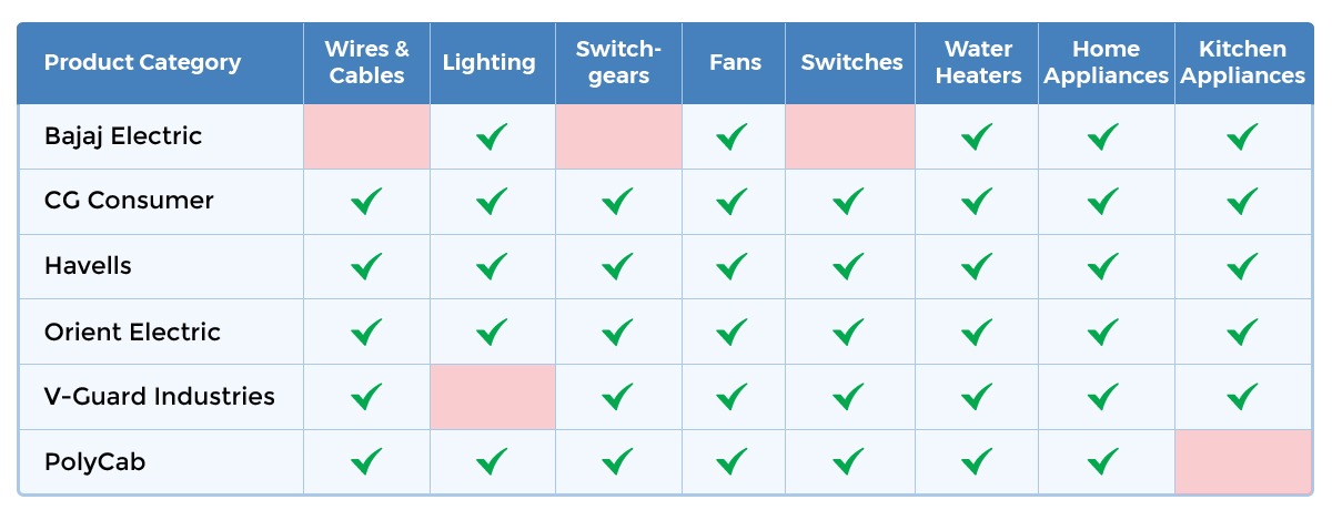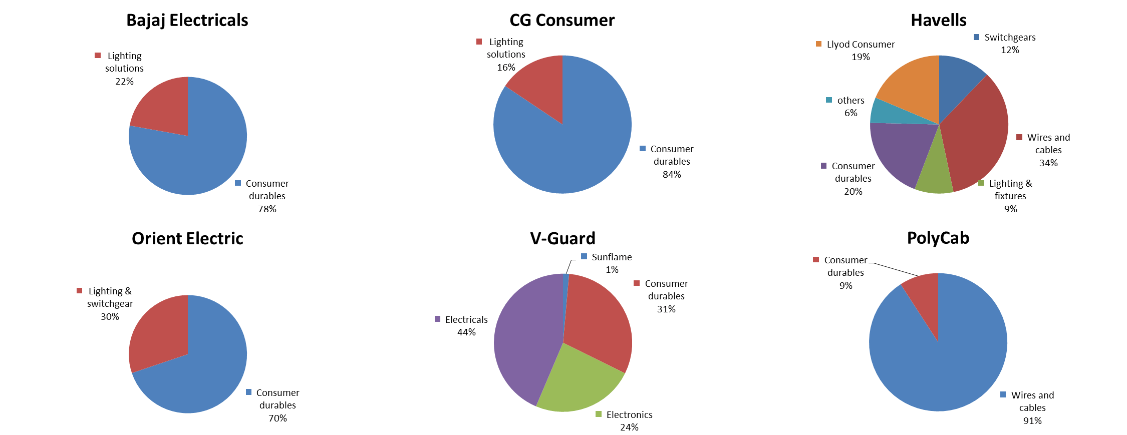 Most players have a presence across product categories, but they often outsource their non-core products. Havells is the largest player in terms of revenue and has a substantial presence across all product categories.