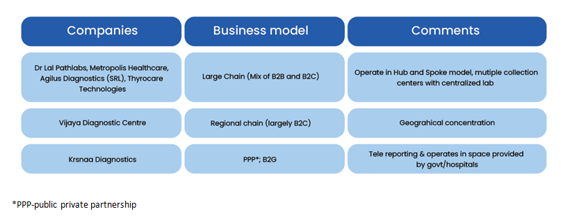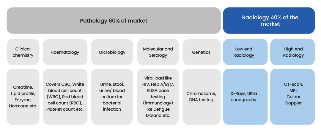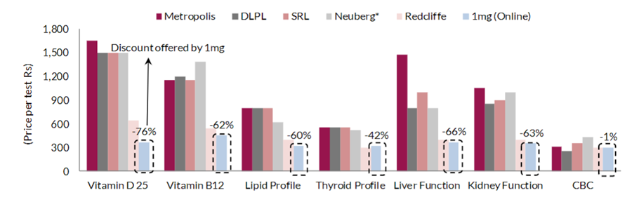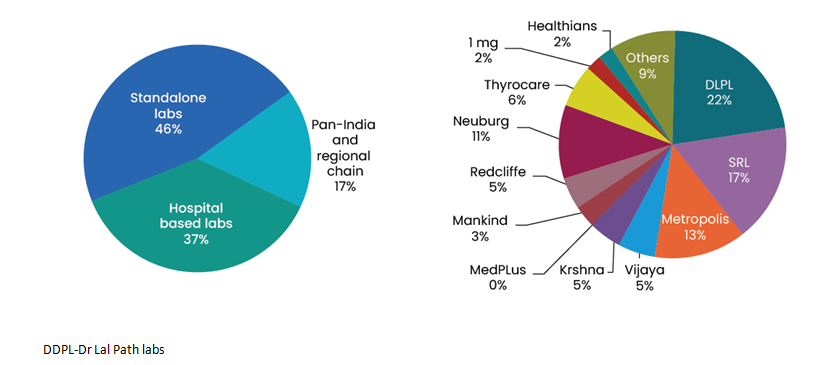 Over the last few years, online players, aggregators, pharma companies, and hospital-based labs have entered the market increasing competition and putting pressure on prices. Notable online players are Tata 1mg (healthcare platform including e-pharmacy etc) and Healthians (tests at home). Pharma companies like Lupin and Mankind Pharma have also ventured into diagnostics. Torrent Pharma and Adani Health are also expected to launch soon.
