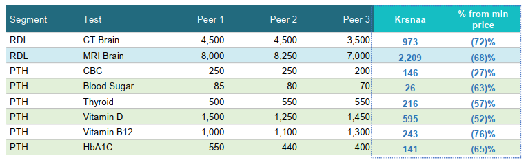 Krsnaa Diagnostics stands out because of its differentiated business model (B2G/PPP) and is able to offer competitive prices given the low cost of setup and volume stability. While few online players adopted disruptive pricing early to gain market share, they are now dialing them back given high customer acquisition costs and funding constraints.