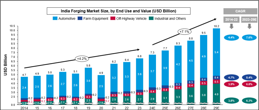 As of FY 2023, the automotive sector holds about 61.8% forged components market share within India. In terms of value, the automotive sector's contribution to forged components was about US$ 3.6 billion in Fiscal 2023 and it is estimated to grow to US$ 5.4 billion in 2029 with a CAGR of 7.6%. The market is expected to grow to 38.7L MT (US$ 10.2 billion) by Fiscal 2029 with the rise in demand of automotive backed by a rise in the working population and an increase in per capita income.