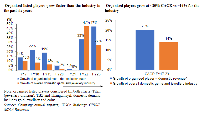In the early 2000s, Tanishq cemented its brand as a trusted urban jeweller by highlighting the purity of its products compared to those of local jewellers. From a low teen market share in 2001, the organised jewellery industry has grown significantly to command 33-38% of the market share in the overall market. While branding has been extremely successful in urban areas, less urban areas have a stronger presence of local unorganized jewellers that resort to adulteration to boost margins at the expense of uninformed buyers that cannot verify the quality of jewellery purchased.