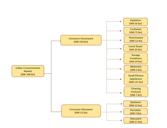 The dining room in India has transformed over the years from merely a place for meals into a center of grace and elegance, especially evident in the evolution of tableware. In India, this shift in tableware is not just about functionality; it has become a lifestyle statement that mirrors the changing attitudes and evolving lifestyles of consumers. Today, there is an increasing consumer preference for branded tableware, which is favored for its aesthetic appeal, affordability, and microwave-friendly attributes. This trend underscores the dynamic nature of the tableware market in India, which, despite its fragmented structure, continues to grow steadily. Particularly noteworthy is the opalware market, which, due to its superior quality compared to alternatives, stands out and shows consistent growth. This growth in specific segments like opalware reflects broader trends in the Indian Consumerware Market, which is divided into two principal categories: Consumer Houseware and Consumer Glassware. These categories are further broken down into an array of segments. Consumer Houseware includes a variety of products such as hydration items, cookware, insulated ware, lunchboxes, storage containers, melamine products, small kitchen appliances, and cleaning products. On the other hand, the Consumer Glassware category features opalware, other types of glassware, and porcelain items. This diverse product range meets a variety of household needs, showcasing the market's ability to adapt and flourish amid India's evolving consumer preferences.