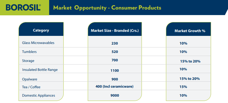 Borosil Limited is a supplier of laboratory glassware, microwaveable kitchenware and opal ware in India. It sells and markets microwavable and flameproof kitchenware and glass tumblers through more than 15,000 retail outlets, and has three manufacturing facilities. The company conducts its operations in two business segments—namely, scientific & industrial products and consumer products.