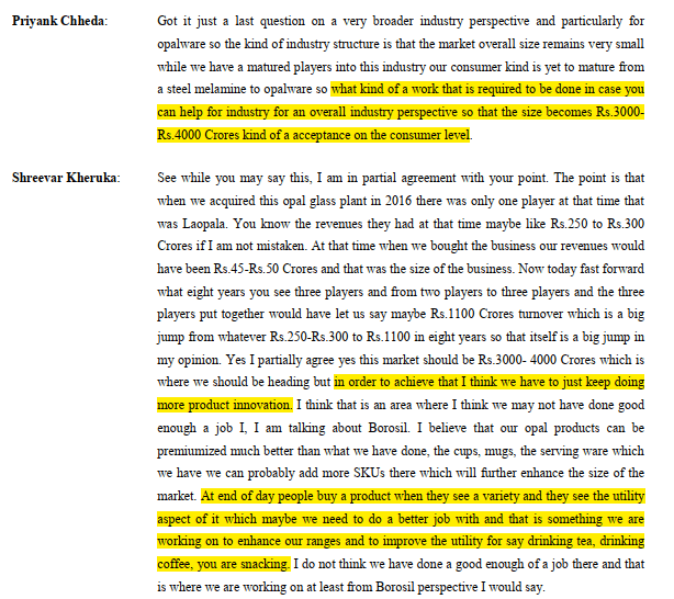 Despite having many tailwinds opalware remains relatively underpenetrated in India, indicating ample room for growth. Currently, opalware is struggling for growth as establishing opalware as a distinct product category requires substantial advertising investments across the industry to educate consumers about its utility.