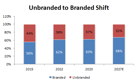 In FY 2022, branded products accounted for approximately 62% of the Indian glassware market, amounting to nearly Rs. 1,800 Cr. This marks a substantial increase from the approximately 56% share, equivalent to around Rs. 800 Cr observed in FY 2015, demonstrating a notable CAGR of 12.7% for the branded segment. It is projected that branded products will further expand their market share to approximately 68% (Rs ~4,300 Cr) by FY 2027. The branded segment is experiencing faster growth compared to the unbranded market, driving overall market growth.