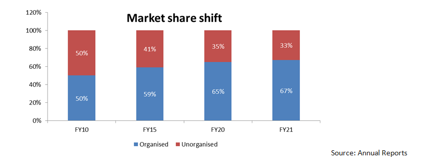 - Top-5 organized players’ share jumped from 22% in FY12 to ~43% in FY21.