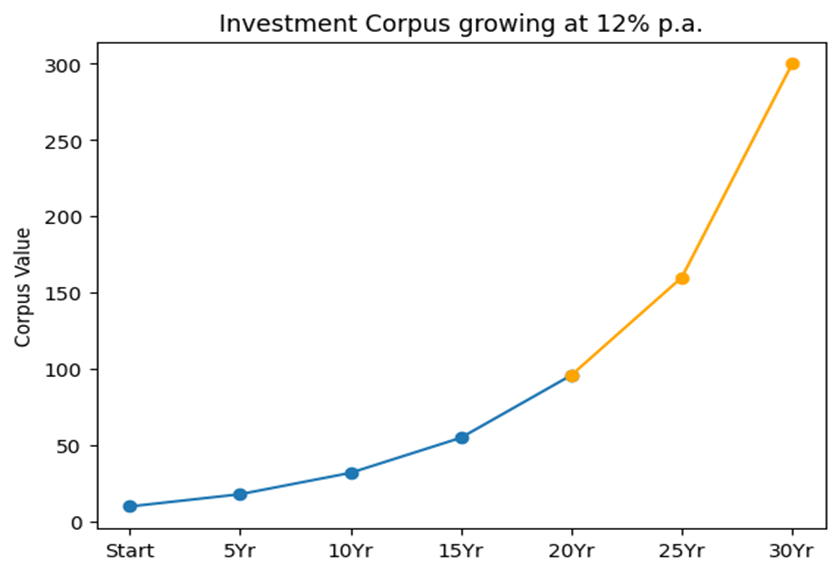 That same ?10 lakhs would have become roughly ?96 lakhs in 20 years and around ?3 crores in 30 years.