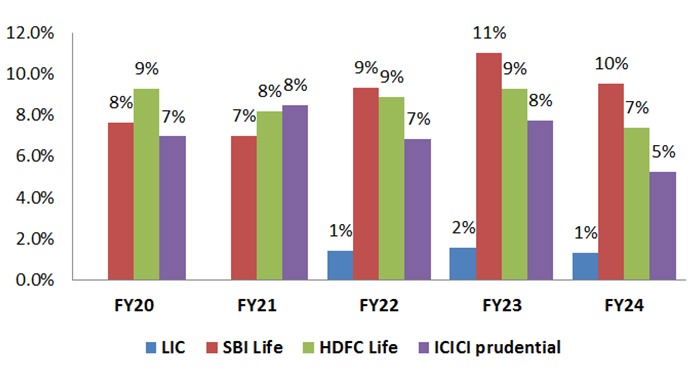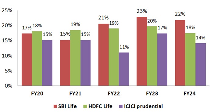 SBI Life benefits from low acquisition expenses due to its distribution arrangements with SBI, providing a competitive edge in pricing and margins. Thus, it has been able to show the highest VNB margins amongst peers and also has been able to grow the fastest even on the large scale that it operates.
