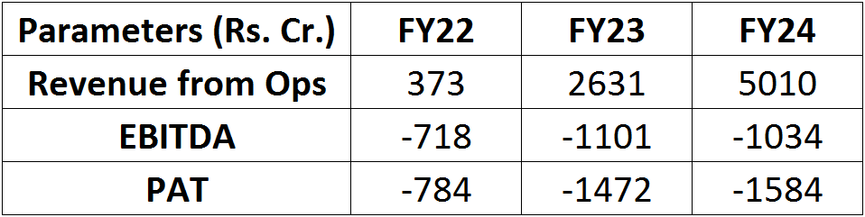 Even though the company is scaling up its revenue at a significant pace, Profits are a distant dream at present with the company incurring a loss of Rs. 1584 Cr in FY24. The path to profitability for the company remains to be an event to watch out for.