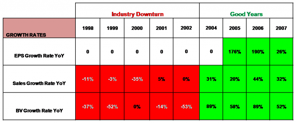 Year 2003's data is missing, but the overall picture is clear and I hope that my point about them looking like turnaround companies is also clear. You'll realize that the company's performance from 1998 to 2002 was pathetic (including negative growth rates). While, during the good years, the returns are spectacular!