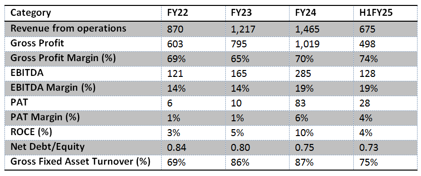 The company’s financial performance reflects robust revenue growth coupled with the benefits of operating leverage. However, its Return on Capital Employed (ROCE) remains subdued, primarily due to a low gross fixed asset turnover of just 75%. Over the coming years, PAT margins are expected to improve, driven by the impact of operating leverage on EBITDA, and a decline in depreciation as a percentage of sales as fixed asset turnover increases. Additionally, a reduction in interest expenses, aided by the utilization of IPO proceeds, is likely to further enhance PAT margins.