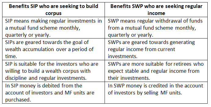 SIP helps you make systematic investments while SWP helps you make systematic withdraw. If an investor is in the beginner stage and looking to invest in a mutual fund with a small amount, SIP is the way to go. And if investors has already accumulated a corpus with an existing Mutual fund and is seeking regular income then SWP is an ideal choice. In fact investors don’t need to choose one over the other. Investors can start SIP today and after 10-15 years once he/she has the corpus then they can opt for the SWP.