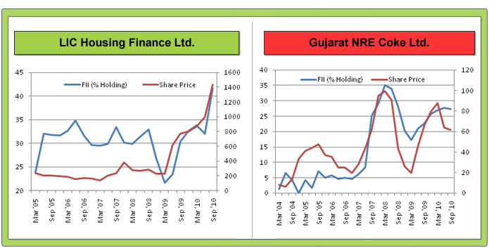 Between 2005 and 2010, FIIs steadily increased their holdings in the company. Even when they trimmed positions in 2008, the decline was limited because the company’s fundamentals were strong. As growth picked up again, FIIs returned — and so did the stock price. - Gujarat NRE Coke: