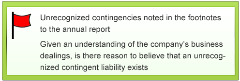 A contingent liability is a potential cash outflow that is dependent on the occurrence of some event. Suppose Mr. A whom we met in the previous Stock Shastras does not use upgraded technology in his bakery. As a result his bakery lets out a lot of smoke through the chimney, polluting the air in the vicinity. A resident of the area notices this and lodges a complaint against him. The result is that Mr. A now has a court case pending against him for environmental damages. Accounting standards state that Mr. A should provide for the possible damages he may have to pay. However, if he does not record this, it would lead to an understatement of a liability. Investors should also be particularly wary if the amount shown under contingent liabilities is very high. Such a situation would demand a thorough investigation of the footnotes of the company pertaining to contingent liabilities.