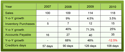 As can be seen, even when revenue and inventory purchases grew in FY 10, accounts payable decreased by 12.5%. Though such a situation does not necessarily indicate an account manipulation, it definitely warrants further scrutiny on the part of investors.