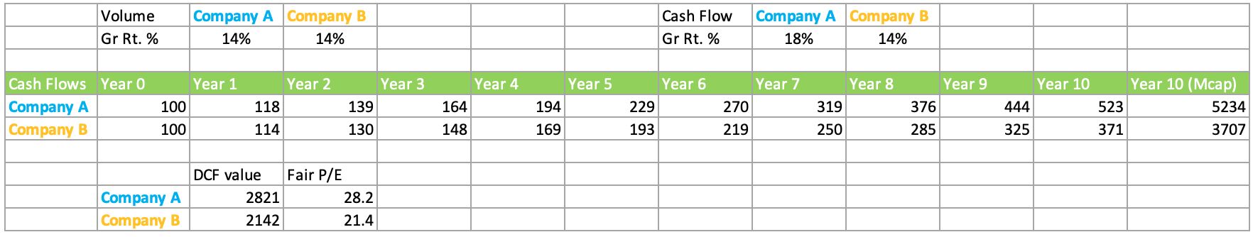 In the above illustration, Company A generates higher cash flows with same volume growth versus Company B. The valuation Company A deserves is 33% higher than Company B.
