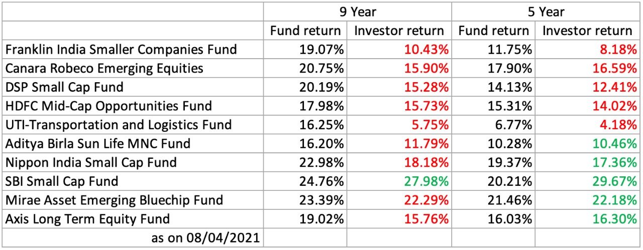 As you can see in the above table investor’s returns are significantly lesser than the fund’s return. This was because investors poured more money after the fund’s performance and pulled out money after its poor performance.