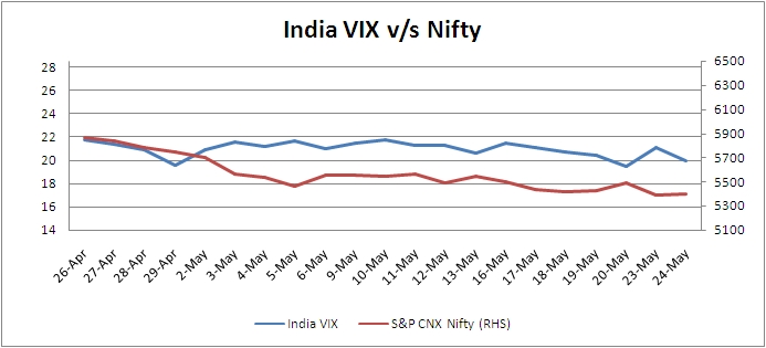 The India VIX declined 5.27% at 19.93 on Tuesday as compared to its previous close of 21.04 on Monday.