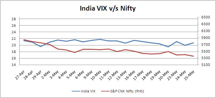 Nifty May 2011 futures closed at 5,348.00, at a discount of 0.95 points over spot closing of 5,348.95, while Nifty June 2011 futures were at 5,342.05 at a discount of 6.90 points over spot closing. The near month May 2011 derivatives contract expires on Thursday, May 26, 2011.Nifty May futures saw addition of 19.06% or 3.96 million (mn) units, taking the total outstanding open interest (OI) to 24.75 mn units.