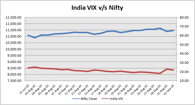 India Volatility Index (VIX), a gauge for market’s short term expectation of volatility decreased by 5.06% and reached 21.80. The 50 share Nifty up by 82.75 points or 0.73% to settle at 11,470.25.
