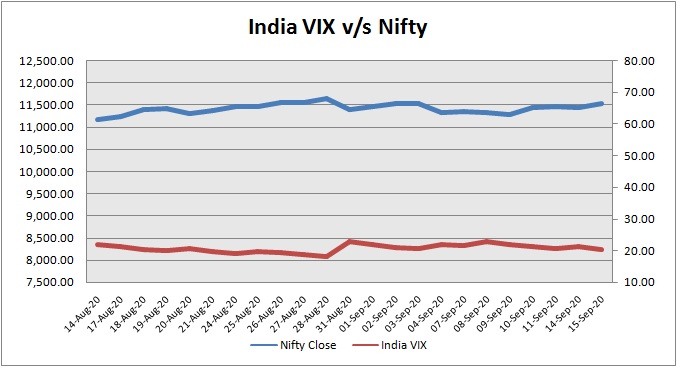 India Volatility Index (VIX), a gauge for market’s short term expectation of volatility decreased by 3.75% and reached 20.40. The 50 share Nifty up by 81.75 points or 0.71% to settle at 11,521.80.