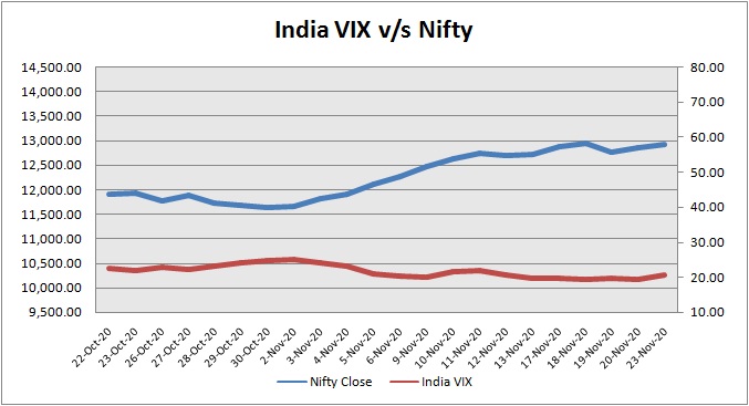 India Volatility Index (VIX), a gauge for market’s short term expectation of volatility increased by 6.09% and reached 20.81.The 50 share Nifty up by 67.40 points or 0.52% to settle at 12,926.45.