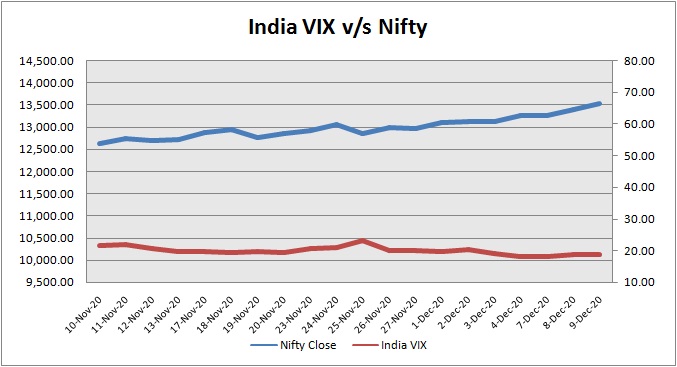 India Volatility Index (VIX), a gauge for market’s short term expectation of volatility increased by 1.62% and reached 18.92. The 50 share Nifty up by 136.15 points or 1.02% to settle at 13,529.10.