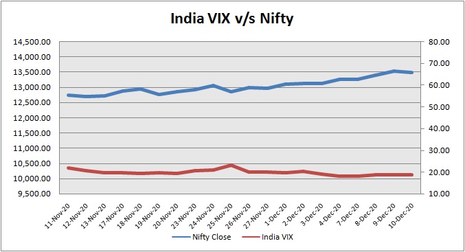Nifty December 2020 futures closed at 13521.75 (LTP) on Thursday, at a premium of 43.45 points over spot closing of 13478.30, while Nifty January 2021 futures ended at 13565.00 (LTP), at a premium of 86.70 points over spot closing. Nifty December futures saw a contraction of 9,145 units, taking the total open interest (Contracts) to 1,57,079 units. The near month derivatives contract will expire on December 31, 2020 (Provisional).