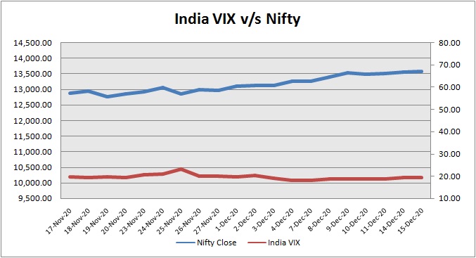 Nifty December 2020 futures closed at 13585.00 (LTP) on Tuesday, at a premium of 17.15 points over spot closing of 13567.85, while Nifty January 2021 futures ended at 13623.85 (LTP), at a premium of 56.00 points over spot closing. Nifty December futures saw an addition of 4,647 units, taking the total open interest (Contracts) to 1,62,488 units. The near month derivatives contract will expire on December 31, 2020 (Provisional).