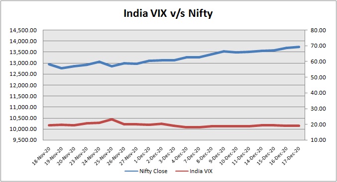 Nifty December 2020 futures closed at 13749.55 (LTP) on Thursday, at a premium of 8.85 points over spot closing of 13740.70, while Nifty January 2021 futures ended at 13791.00 (LTP), at a premium of 50.30 points over spot closing.  Nifty December futures saw an addition of 6,812 units, taking the total open interest (Contracts) to 1,73,377 units. The near month derivatives contract will expire on December 31, 2020 (Provisional).