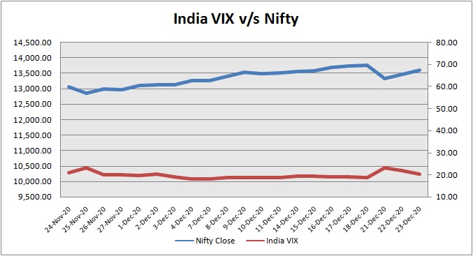 Nifty December 2020 futures closed at 13619.05 (LTP) on Wednesday, at a premium of 17.95 points over spot closing of 13601.10, while Nifty January 2021 futures ended at 13669.00 (LTP), at a premium of 67.90 points over spot closing. Nifty December futures saw an addition of 1,537 units, taking the total open interest (Contracts) to 1,46,767 units. The near month derivatives contract will expire on December 31, 2020 (Provisional).
