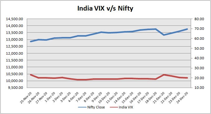 India Volatility Index (VIX), a gauge for market’s short term expectation of volatility decreased by 2.57% and reached 19.97. The 50 share Nifty up by 148.15 points or 1.09% to settle at 13,749.25.