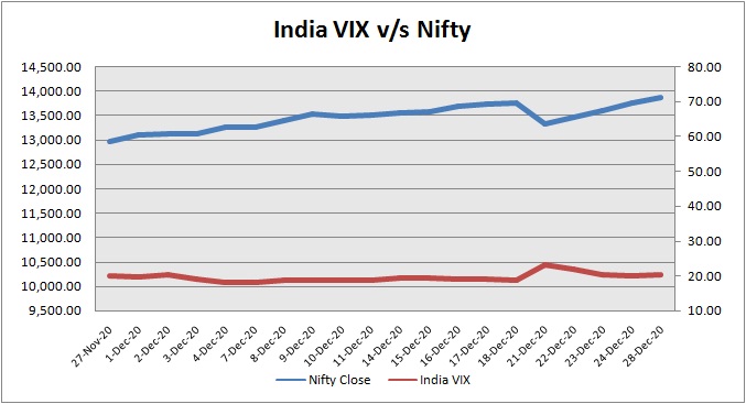 India Volatility Index (VIX), a gauge for market’s short term expectation of volatility increased by 2.30% and reached 20.43. The 50 share Nifty up by 123.95 points or 0.90% to settle at 13,873.20.