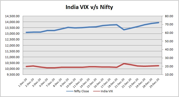India Volatility Index (VIX), a gauge for market’s short term expectation of volatility increased by 1.77% and reached 20.79. The 50 share Nifty up by 59.40 points or 0.43% to settle at 13,932.60.