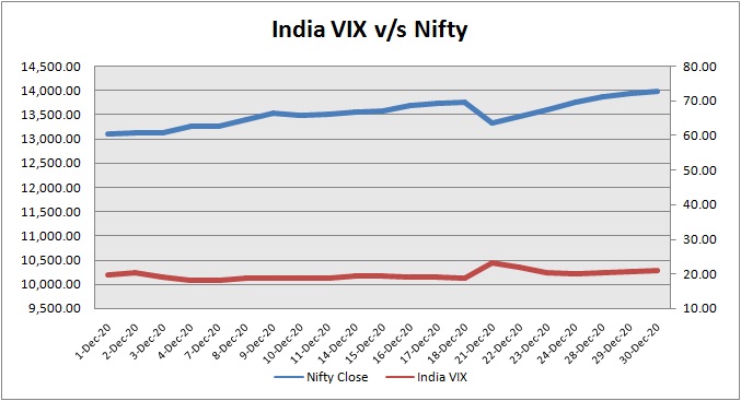 Nifty December 2020 futures closed at 13978.00 (LTP) on Wednesday, at a discount of 3.95 points over spot closing of 13981.95, while Nifty January 2021 futures ended at 14035.90(LTP), at a premium of 53.95 points over spot closing.  Nifty December futures saw an addition of 2,595 units, taking the total open interest (Contracts) to 1,12,722 units. The near month derivatives contract will expire on December 31, 2020 (Provisional).