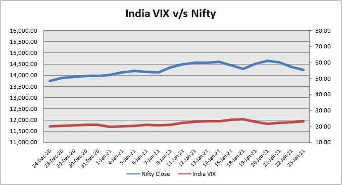Indian benchmark -- Nifty continued its fall on third day and finished the session with a cut of over half a percent. Initially, market made a decent opening with private report that India’s economy showed signs a recovery is taking root as waning virus cases and a vaccine roll-out supported sentiment and as focus turns to further stimulus possible in the upcoming federal budget. However, soon market turned volatile, with the RBI data showing that the country's foreign exchange reserves declined by $1.839 billion to $584.242 billion in the week ended January 15. Traders failed to took support with report that foreign portfolio investors (FPI) remained net buyers to the tune of Rs 18,456 crore so far in January as global liquidity led to continued investment in emerging markets. Further, market added more losses even after UN has said that foreign Direct Investment into India rose by 13 per cent in 2020, boosted by interest in the digital sector, and while fund flows 'declined most strongly' in major economies such as the UK, the US and Russia due to the COVID-19 pandemic, India and China ‘bucked the trend’. Finally, Nifty ended the day’s trade below its 14250 level.
