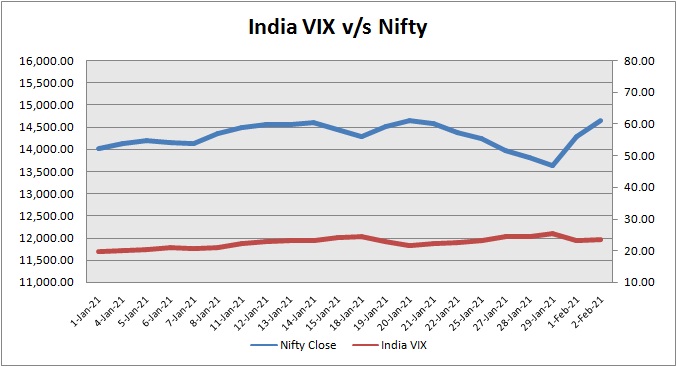 India Volatility Index (VIX), a gauge for market’s short term expectation of volatility increased by 0.09% and reached 23.35. The 50 share Nifty up by 366.65 points or 2.57% to settle at 14,647.85.