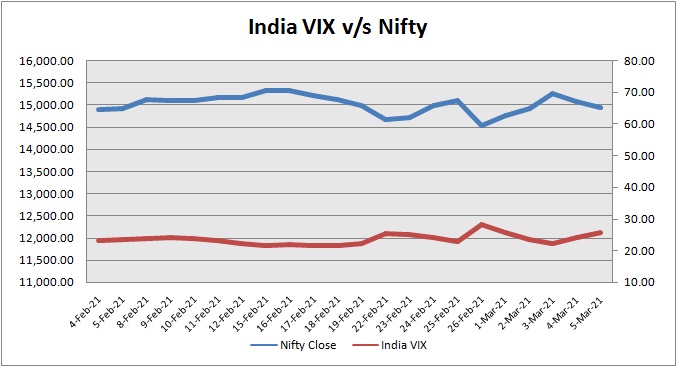 India Volatility Index (VIX), a gauge for market’s short term expectation of volatility increased by 5.83% and reached 25.56. The 50 share Nifty down by 142.65 points or 0.95% to settle at 14,938.10.
