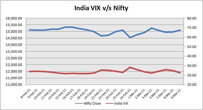 Nifty March 2021 futures closed at 15145.00 (LTP) on Tuesday, at a premium of 46.60 points over spot closing of 15098.40, while Nifty April 2021 futures ended at 15216.00 (LTP), at a premium of 117.60 points over spot closing. Nifty March futures saw a contraction of 8,634 units, taking the total open interest (OI) to 1,62,819 units. The near month derivatives contract will expire on March 25, 2021 (Provisional).