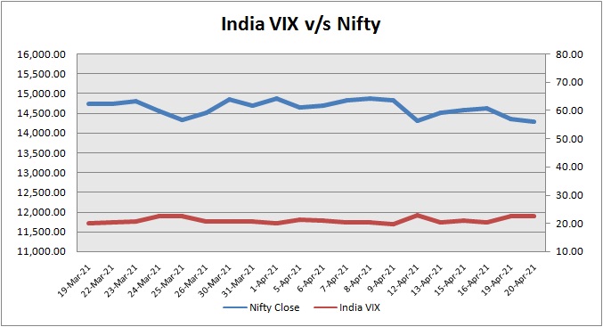 Nifty April 2021 futures closed at 14290.00 (LTP) on Tuesday, at a discount of 6.40 points over spot closing of 14296.40, while Nifty May 2021 futures ended at 14342.25 (LTP), at a premium of 45.85 points over spot closing. Nifty April futures saw an addition of 8,294 units, taking the total open interest (Contracts) to 1,54,090 units. The near month derivatives contract will expire on April 29, 2021 (Provisional).