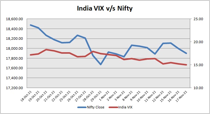 India Volatility Index (VIX), a gauge for market’s short-term expectation of volatility decreased by 1.41% and reached 14.98. The 50 share Nifty down by 100.55 points or 0.56% to settle at 17,898.65.