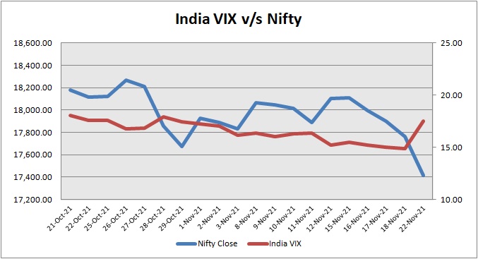 India Volatility Index (VIX), a gauge for market’s short-term expectation of volatility decreased by 17.92% and reached 17.52. The 50 share Nifty down by 348.25 points or 1.96% to settle at 17,416.55.
